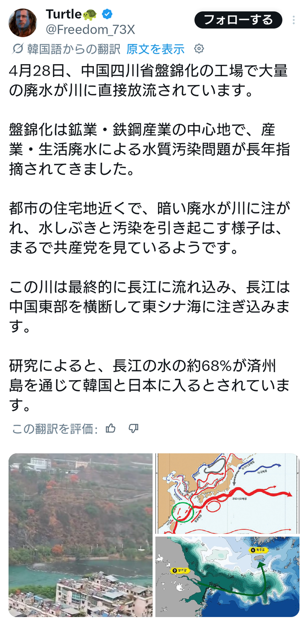 経済崩壊の中国・四川省で、工場から大量の汚染廃水が川に直接放流される。いずれ日本へ