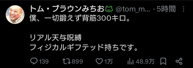 トム・ブラウンみちお「僕、一切鍛えず背筋300キロ」