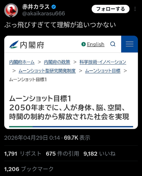 内閣府公式:2050年までに、人が身体、脳、空間、時間の制約から解放された社会を実現