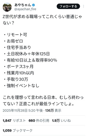 Z世代「手取り月30万・リモート可・年休125・残業10h未満。これが最低ライン」