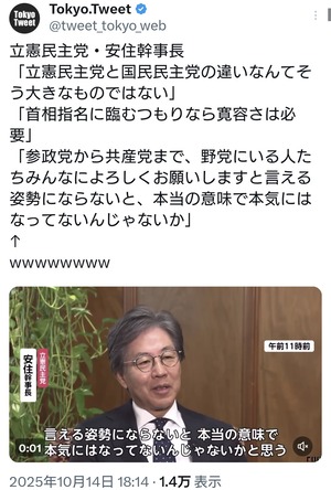 【悲報】立憲「立憲と国民民主の違いなんてそうない。首相指名に臨むつもりなら寛容さは必要」
