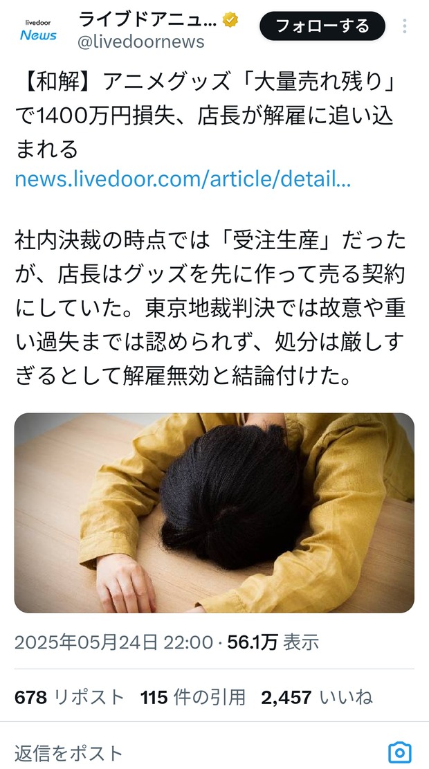 アニメグッズが大量売れ残りで1400万円の損失を出し店長が解雇…不当だと訴えた裁判で解雇無効の判決が出る
