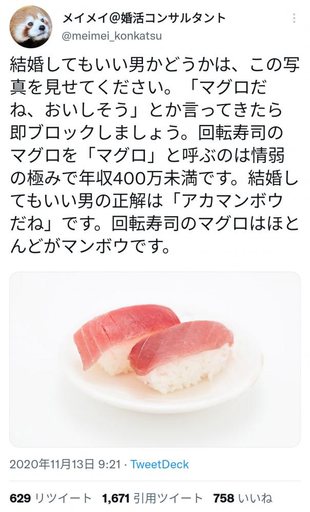 女「このお寿司どう?」男「美味しそうなマグロだね」女「うわぁ…コイツ年収400万未満の情弱だ…」