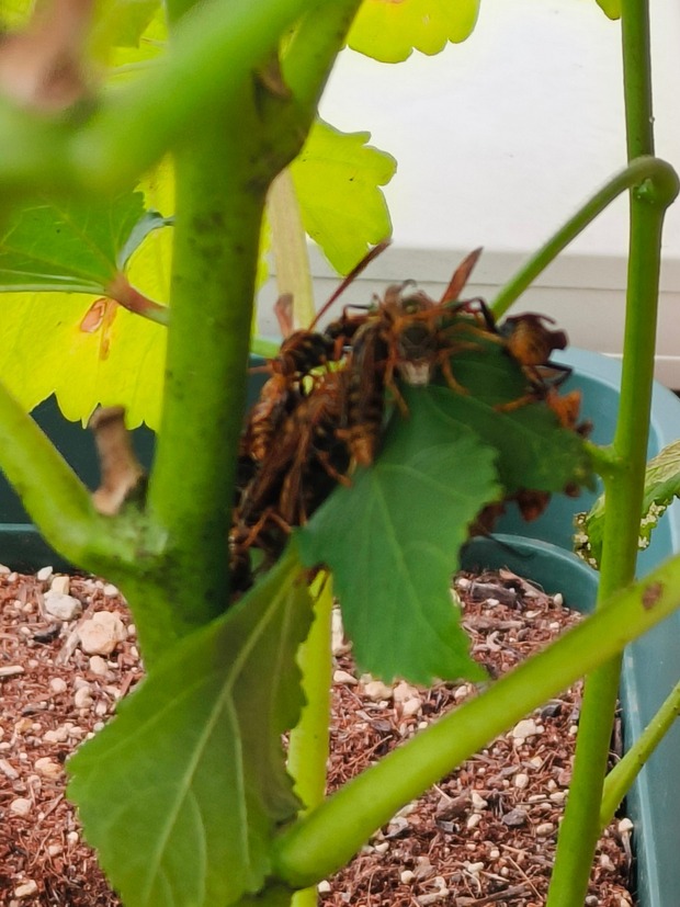 【画像】しばらく前からベランダで育ててるオクラに大量に蜂が集まってるんだけどなにこれ??