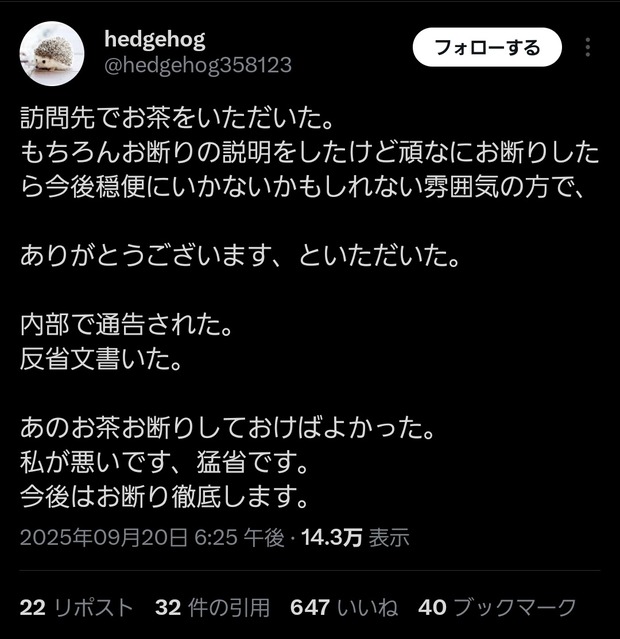【速報】介護士さん、訪問先でうっかり出されたお茶を飲んでしまったことを同僚にチクられて反省文を書かされる
