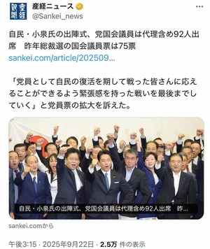 【速報】小泉進次郎の総裁選出陣式、なんと議員が100人超集まる異常事態!!!!!!