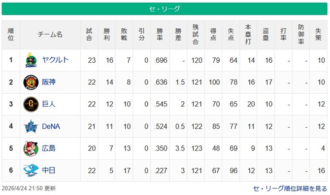 【セ順位スレ】燕-=虎==兎-星-//===鯉===竜【4/24】