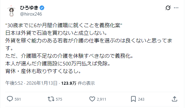 ひろゆき「30歳までに6ヶ月間介護施設で働く事を義務化せよ。ただし500万円納付した人は免除とする」