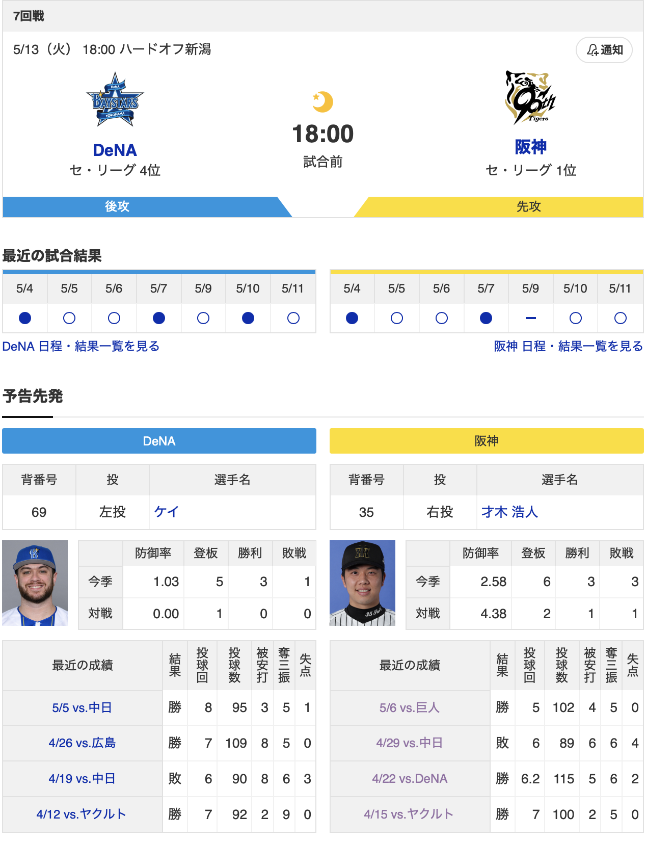 【虎実況】DeNA VS 阪神(ハードオフ新潟)5/13(火)18:00〜