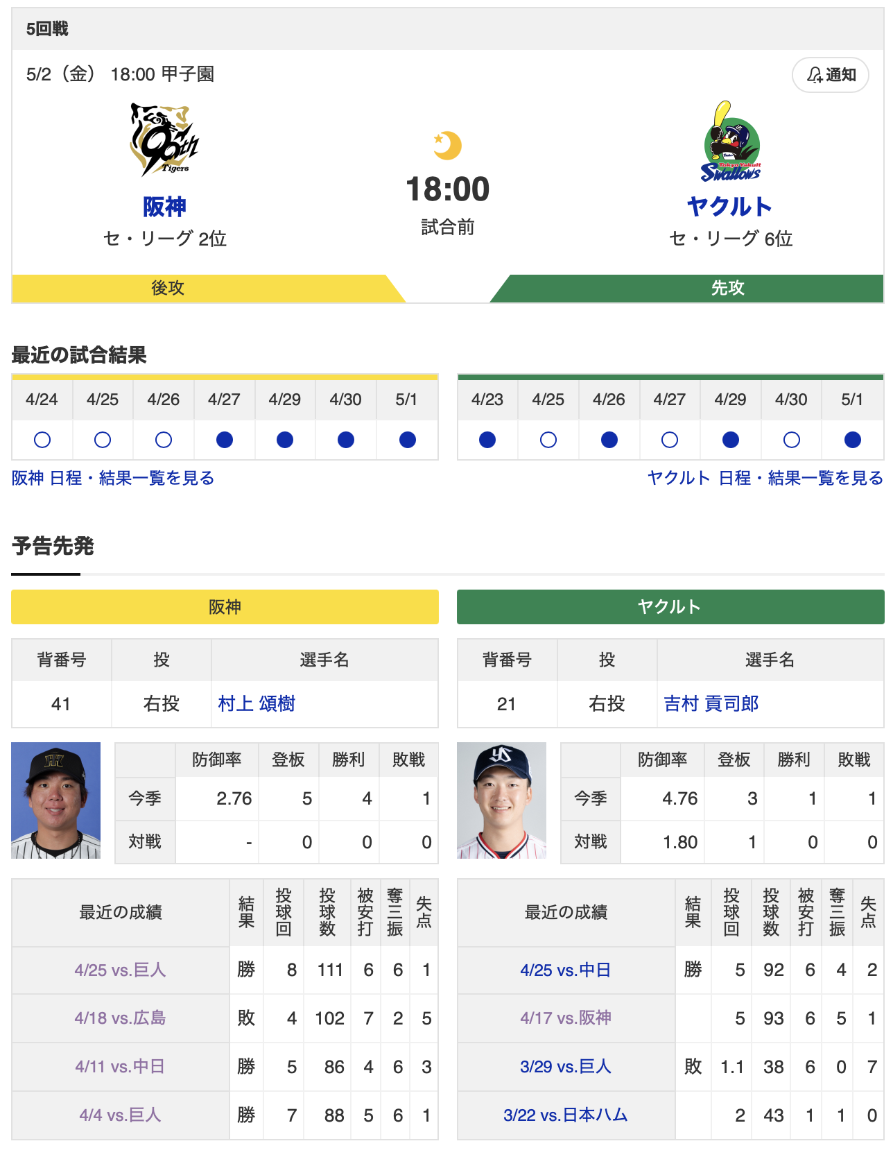 【虎実況】阪神 VS ヤクルト(甲子園)5/2(金)18:00〜