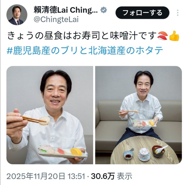 【朗報】台湾総統「今日の昼食はお寿司と味噌汁です????????」