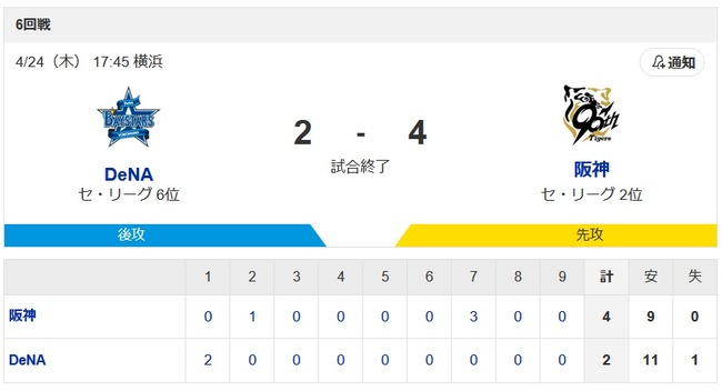 【4/24】●●●●●●横浜 ●●●●東京 ●●中日 読売○○○ 阪神○○○○ 広島○○○○○