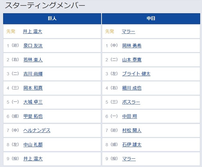 【巨人対中日4回戦】5(一) 大城 卓三 8(左) 中山 礼都