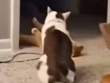 部屋の入り口で寝ている奴がいた。邪魔じゃワレ! → 猫はこうしちゃう…