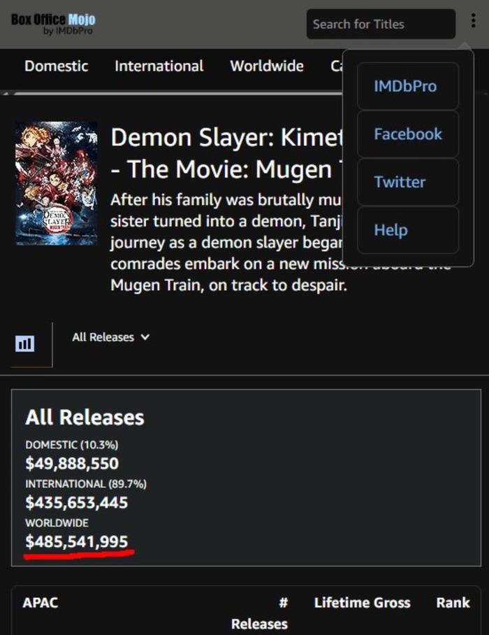 韓国人「日本以外で鬼滅の刃無限列車が大ヒットした国ランキングがこちら‥」→「北米・台湾・フランスが凄いですね…」