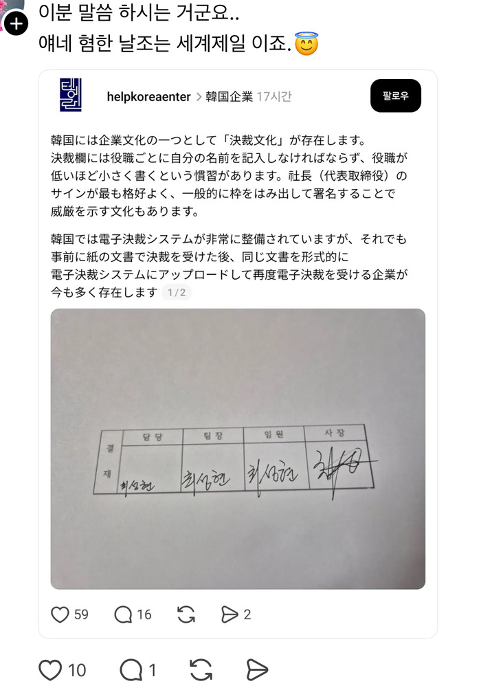 韓国人「日本人が衝撃を受けた韓国の企業文化がこちらです‥」→「重ねて承認する仕組みに驚いた…(ブルブル」