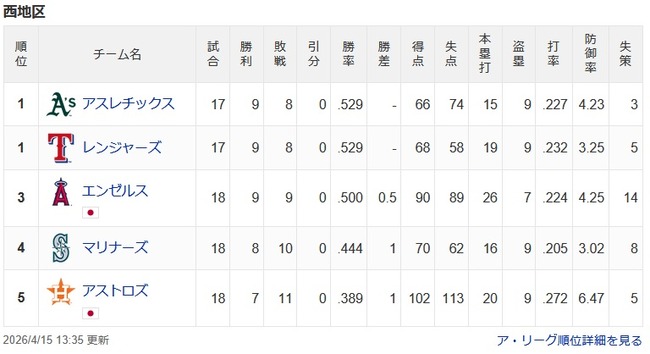 ワイ「やったぜ、アスレチックス9勝8敗で何とか首位復帰だ! さて…ドジャースはっと……」