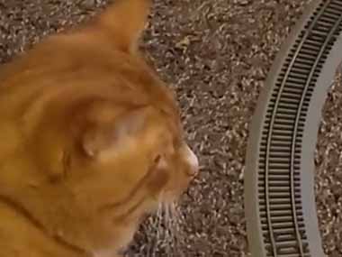 ネコの目の前を鉄道模型が走ってきた。イタズラもせず、大人しく見ていて良い子だね → さすがです…