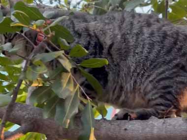 ネコが木から下りようとしていた。滑って豪快に落ちる! → と思ったら…
