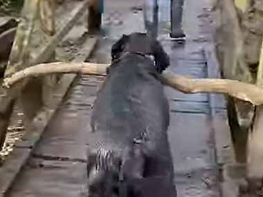 イヌが長い木を咥えて橋を渡ろうとしていた。でも欄干に引っかかる! → すると賢い犬はこうします…
