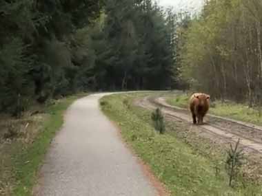 森の散歩道を歩いていた。向かいから1頭の牛が歩いてきた。のどかだなぁ♪ → と思ったら…