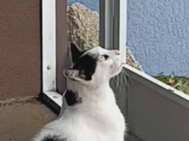 彼が扉の前にいた。見上げたまま動かない。どうしたの? → こうやって出て行きます…