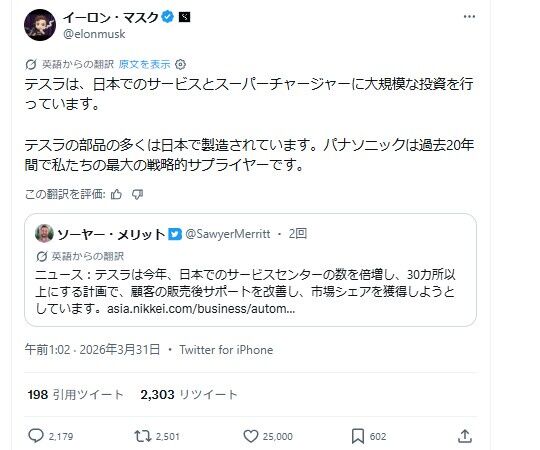 イーロン・マスク「テスラは日本に対し大規模な投資をする」