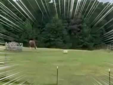 牧場を何かが全力でやってくる。やばい朝飯に遅れちゃう! → 食いしん坊はこちらです…